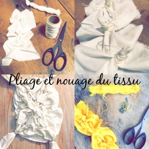 Quitte à faire des essais de teinture, j’ai testé cette méthode japonaise de pliage et nouage des tissus avant teinture. Elle porte également d’autres noms dans d’autres parties du monde. Mais au Japon ils ont développé un véritable art en la matière, avec des pliages et nouages très élaborés, donnant des résultats aux graphismes très recherchés et d’un très beau rendu, qu’on voit souvent avec des teintures à l’indigo. Cette préparation du tissu à sec, permet de rendre des parties du tissu que la teinture ne peut pas atteindre, révélant ainsi les motifs très sympa lorsqu’on retire les liens au moment des rinçages.