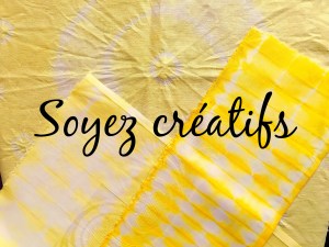Je n’ai testé que deux motifs, les ronds en nouant une petite pointe de tissu, et les bandes en pliant le tissu en accordéon avant de le teindre. On peut utiliser des élastiques ou du fil, enroulés très serrés autour du tissu ne permettant pas à la couleur de passer, les motifs sont ressortis blancs. J’ai été très satisfaite du résultat. Une fois qu’on en comprend le principe la créativité peut s’exprimer. Ce que j’ai fait avec le deuxième bain de teinture, même si les motifs sont ressortis moins marqués avec mon jaune moins intense sur le fond du tissu. Le côté surprise en défaisant les liens est vraiment très prenant, même s’il faut quand même avoir la patience d’attendre le refroidissement…